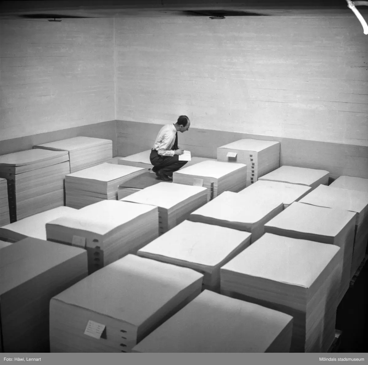 Man i arbete vid kartongfärdigställningen på pappersbruket Papyrus i Mölndal, 1/2 1960. Fotografi för årsberättelsen 1959.