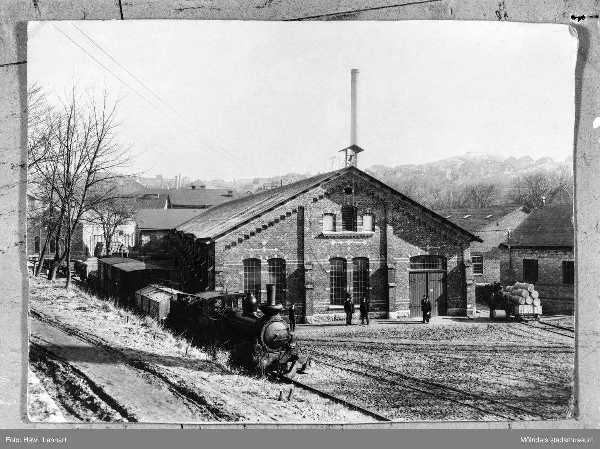Bild från pappersbruket Papyrus fabriksområde, byggnaden närmast kallades Trekanten. Exteriör från 1899-1901. Reprofotografi, 19/12 1960.