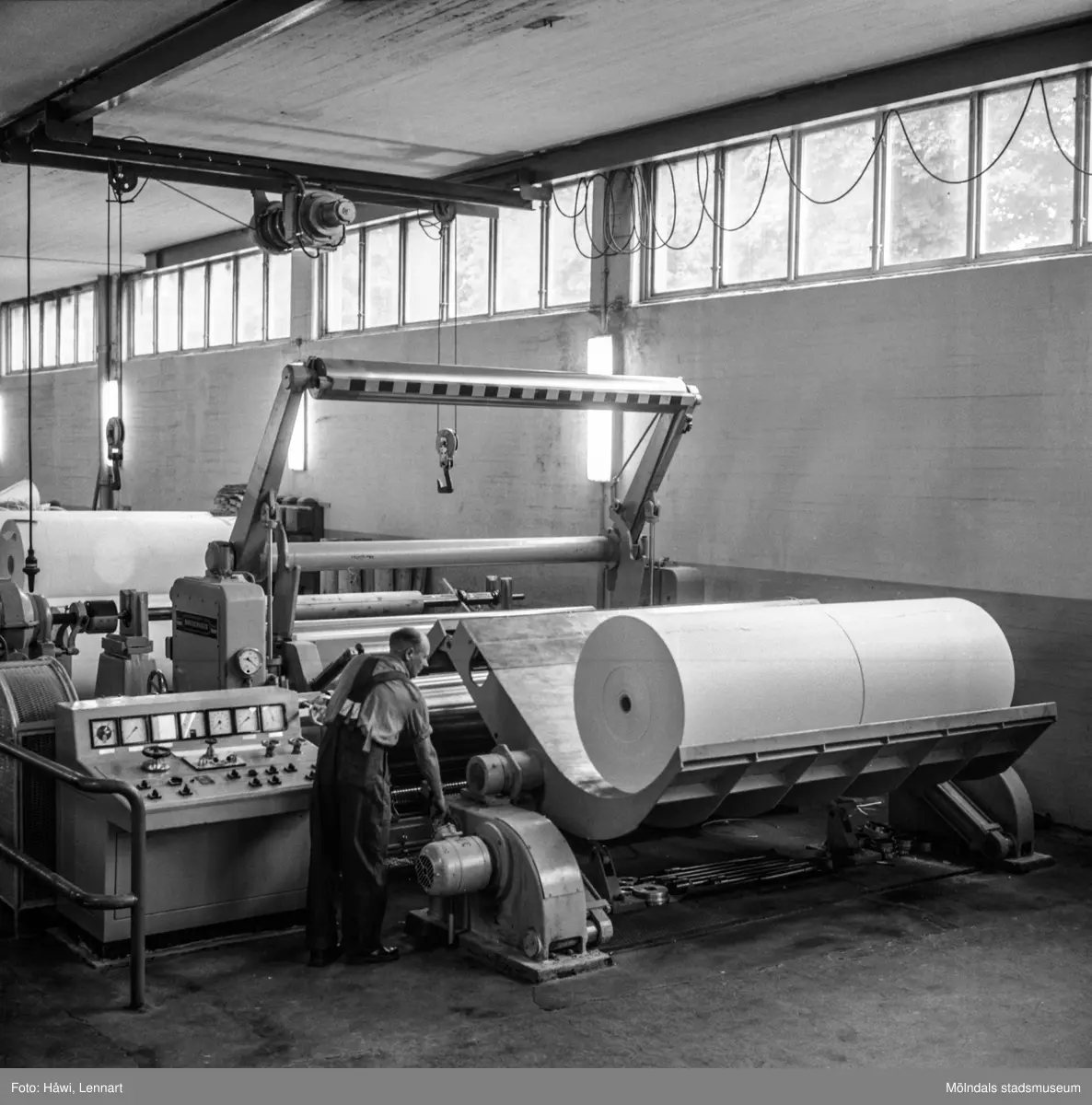 Man i arbete vid rullstol nr 10, kartong, på pappersbruket Papyrus i Mölndal, 30/8 1962.