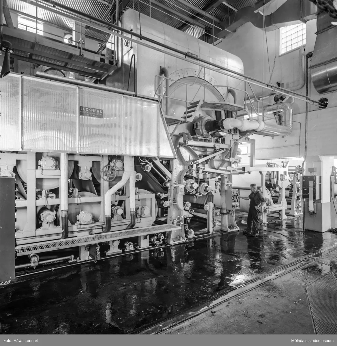 Man i arbete vid PM6, bestrykningsmaskin nr 1 på pappersbruket Papyrus i Mölndal, 8/9 1964.
