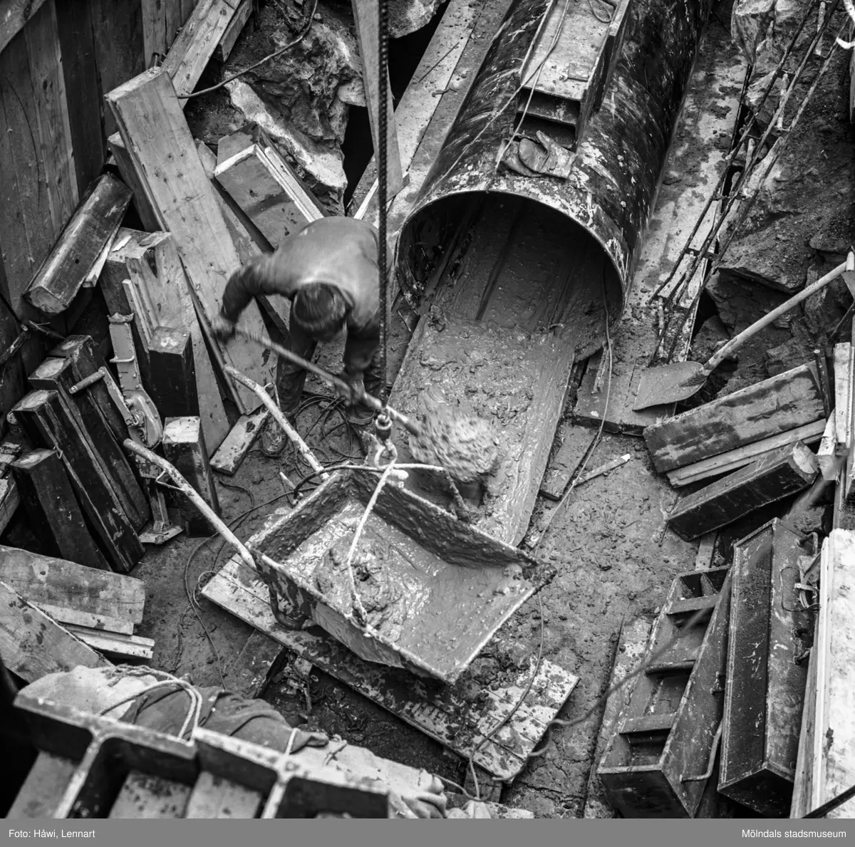 Man i arbete vid avloppskanal till PM5N på pappersbruket Papyrus i Mölndal, 14/4 1964.