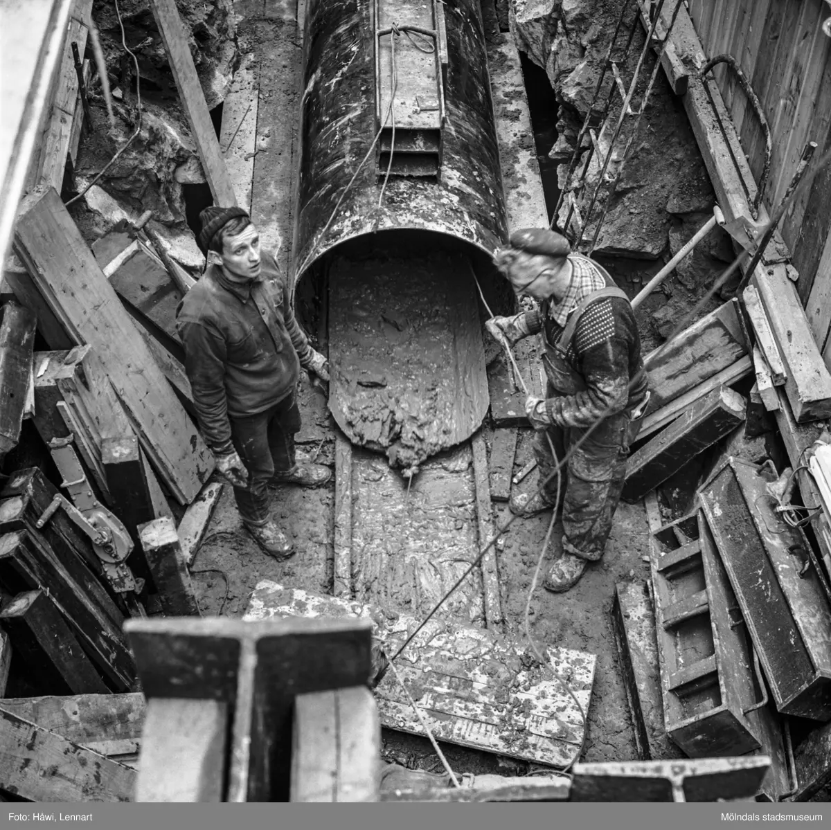 Män i arbete vid avloppskanal till PM5N på pappersbruket Papyrus i Mölndal, 14/4 1964.