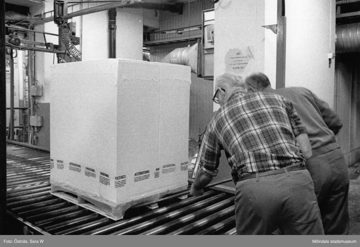 Gotthard Olsson och Tage Carlsson i arbete på pappersbruket Papyrus i Mölndal, år 1990.