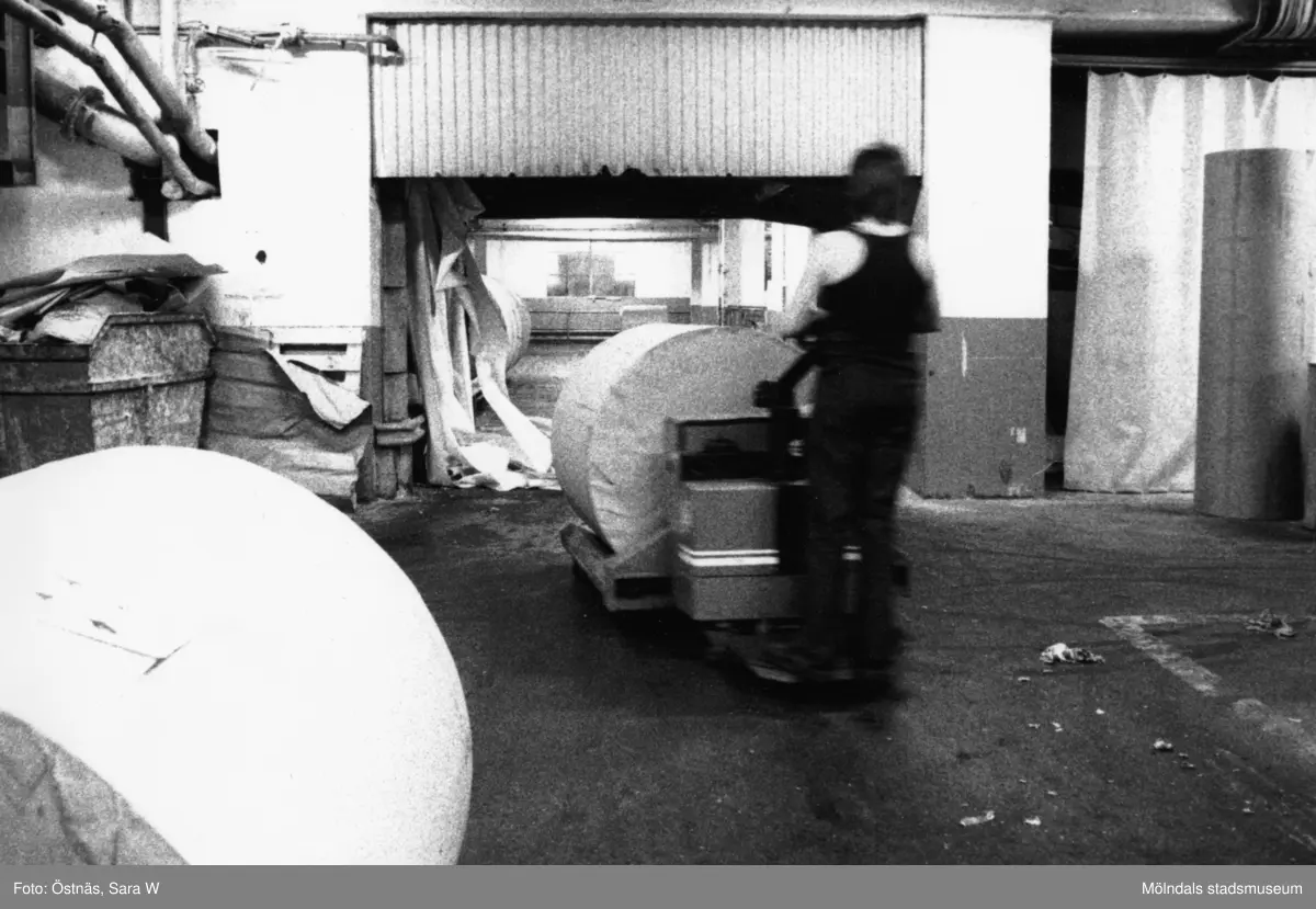 Slawomir Ribjer transporterar kartongrulle med truck på pappersbruket Papyrus i Mölndal, år 1990.