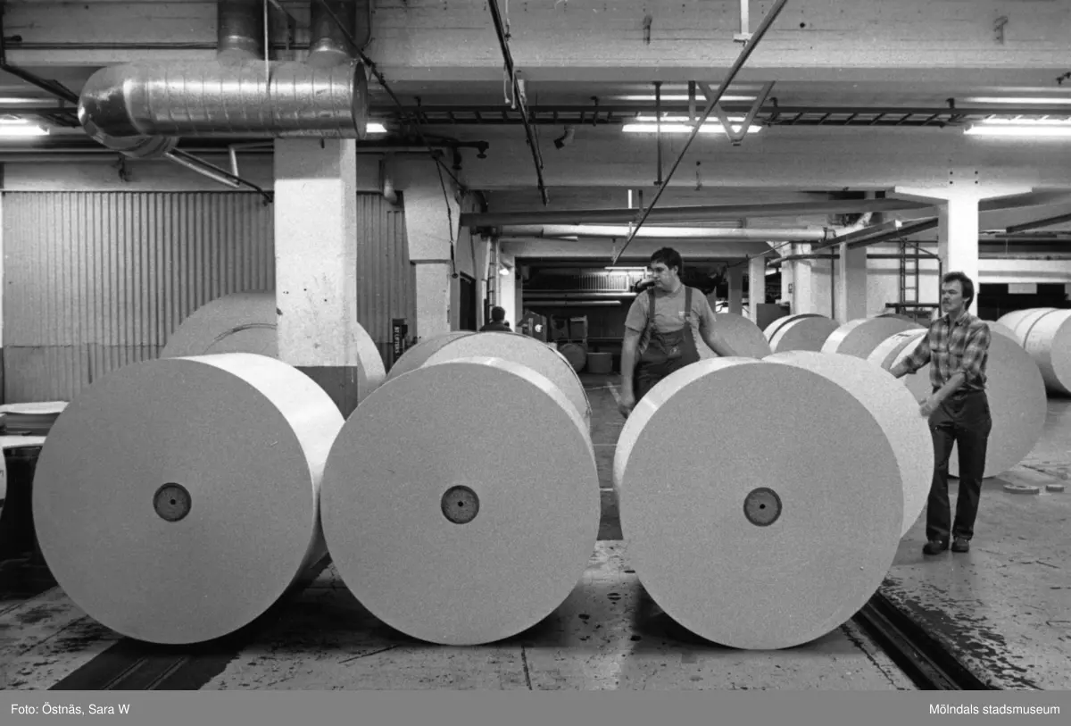 Stefan Roslund och Lennart Landh i arbete på pappersbruket Papyrus i Mölndal, år 1990.