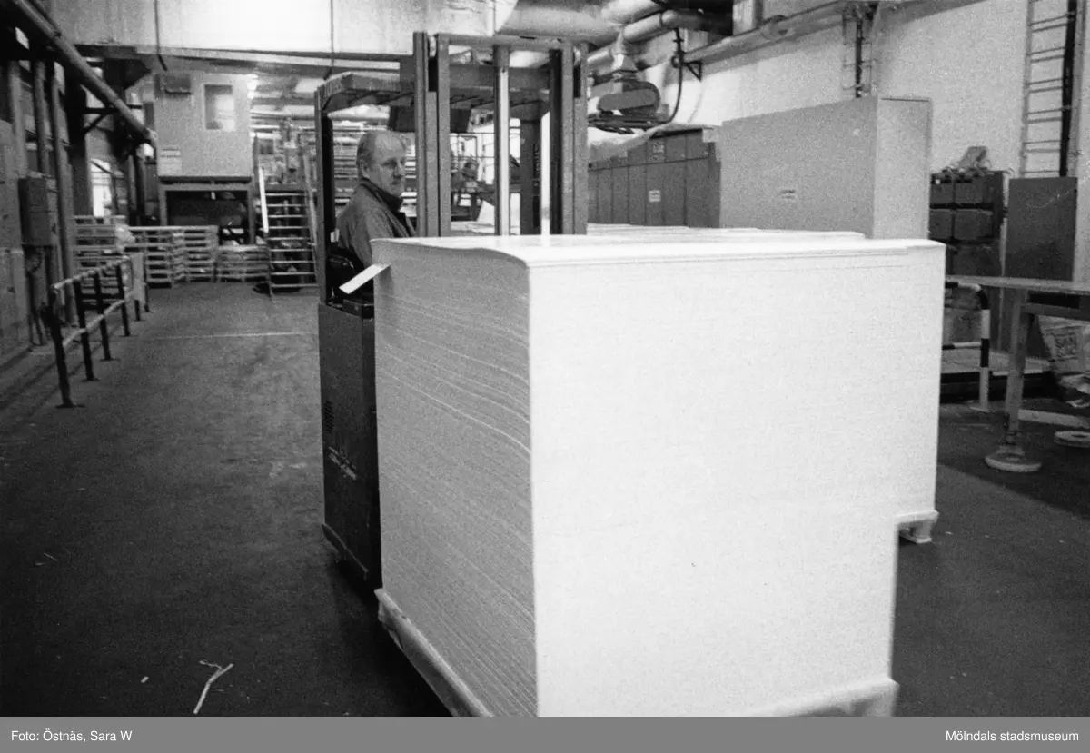 Arne Larsson transporterar pall med truck på pappersbruket Papyrus i Mölndal, år 1990.
