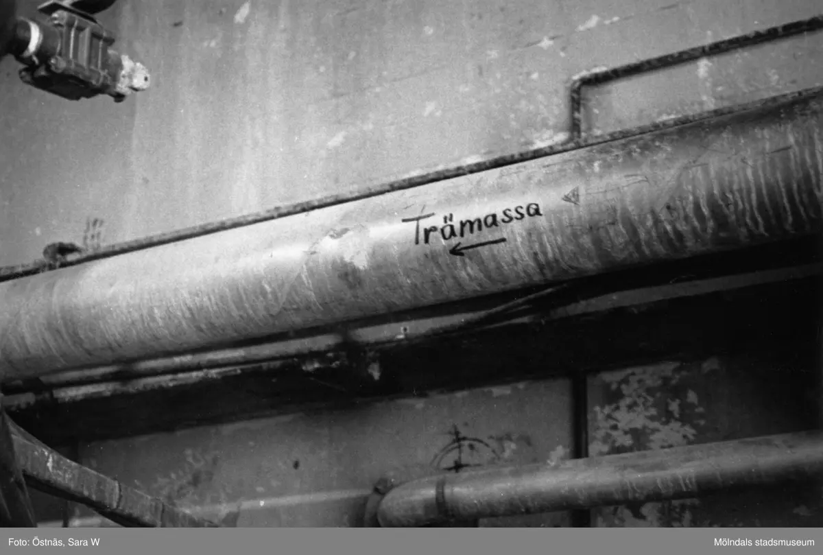 Pappersmassa på väg genom rör på pappersbruket Papyrus i Mölndal, år 1990.