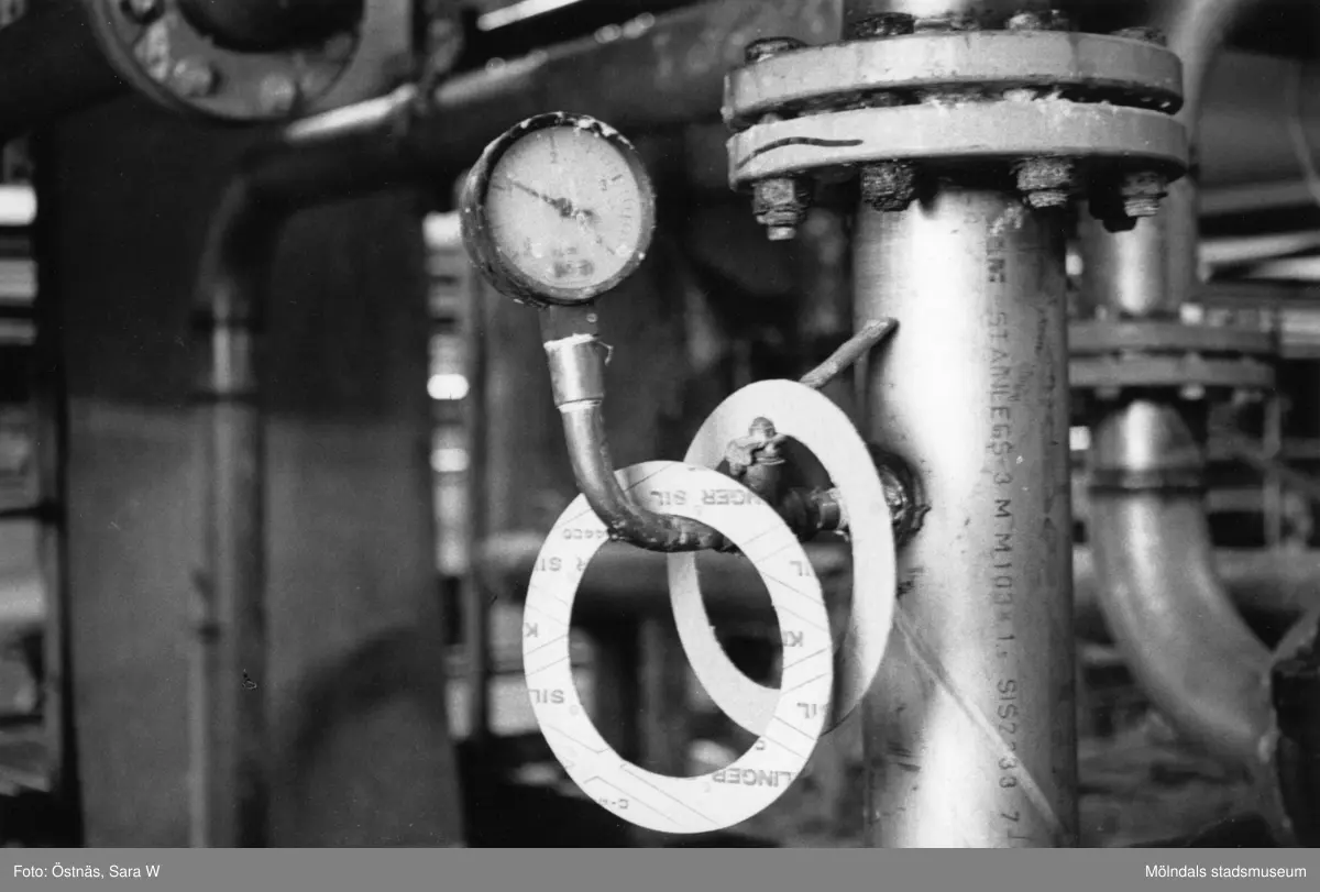 Ledningsrör med mätare på pappersbruket Papyrus i Mölndal, år 1990.