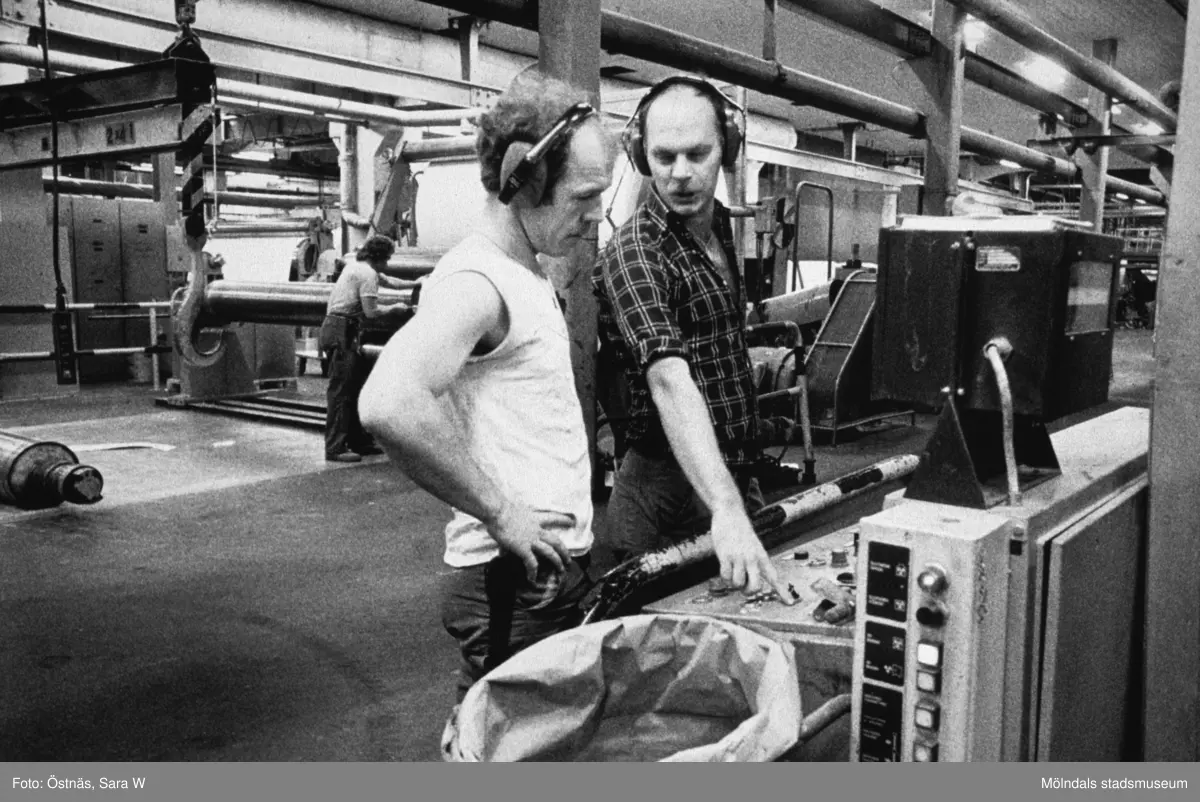 Jan Callesen och Denny Andersson i arbete vid maskin på pappersbruket Papyrus i Mölndal, år 1990.
