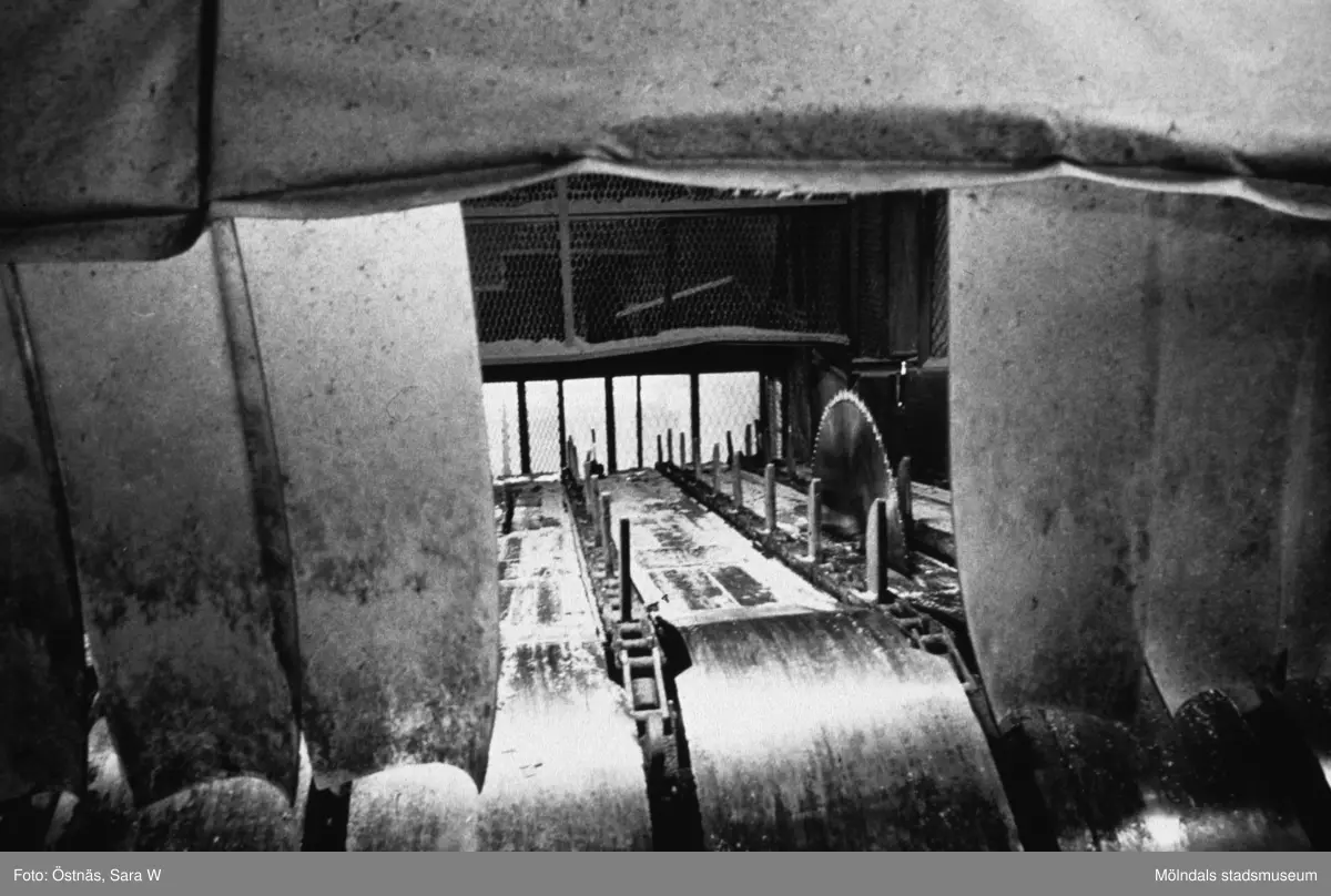 Titel: Såg för kapning av massaved på pappersbruket Papyrus i Mölndal, år 1990.