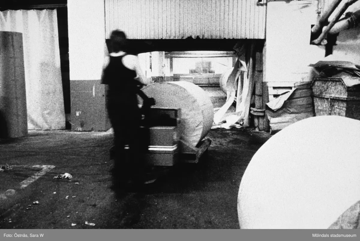 Slawomir Ribjer transporterar kartongrulle med truck på pappersbruket Papyrus i Mölndal, år 1990.