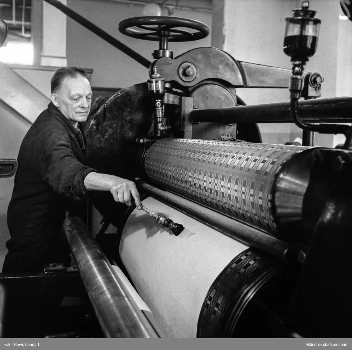 Man i arbete vid gauffrerkalander nr 5 på pappersbruket Papyrus i Mölndal, 6/5 1955.