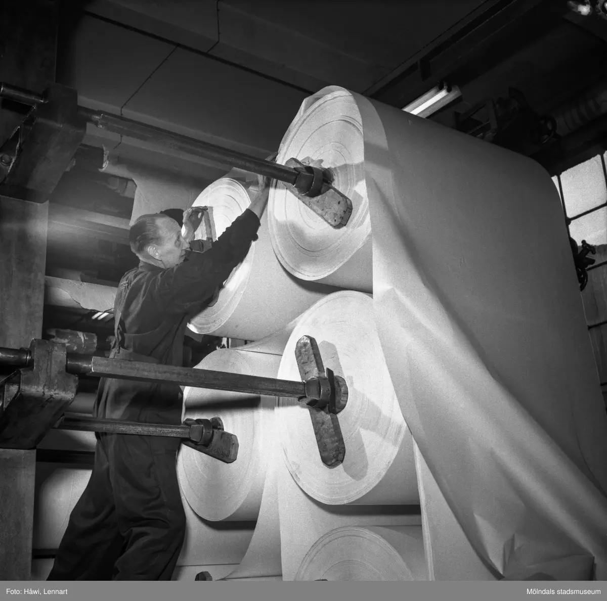 Man i arbete vid klipp nr 1 på pappersbruket Papyrus i Mölndal, 6/5 1955.