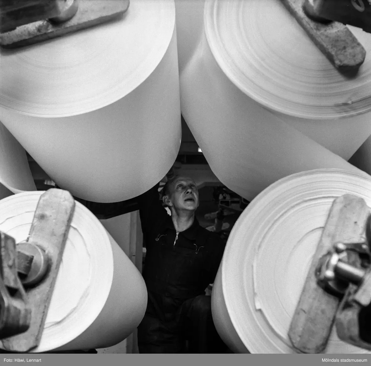Man i arbete på pappersbruket Papyrus i Mölndal, 6/5 1955.