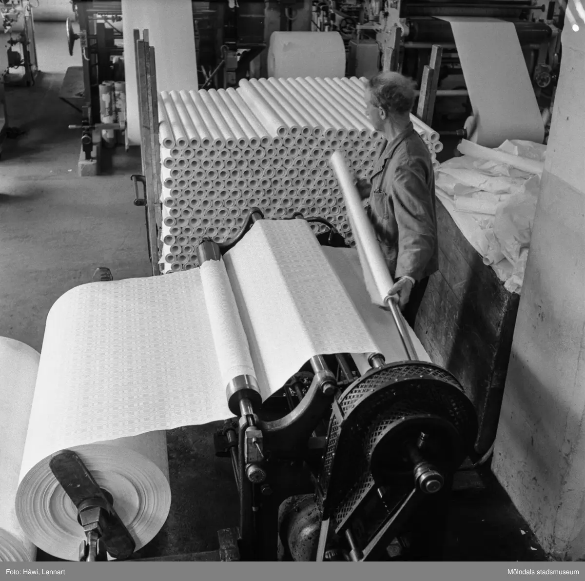 Man i arbete vid rullmaskin nr 24 på pappersbruket Papyrus i Mölndal, 6/5 1955.
