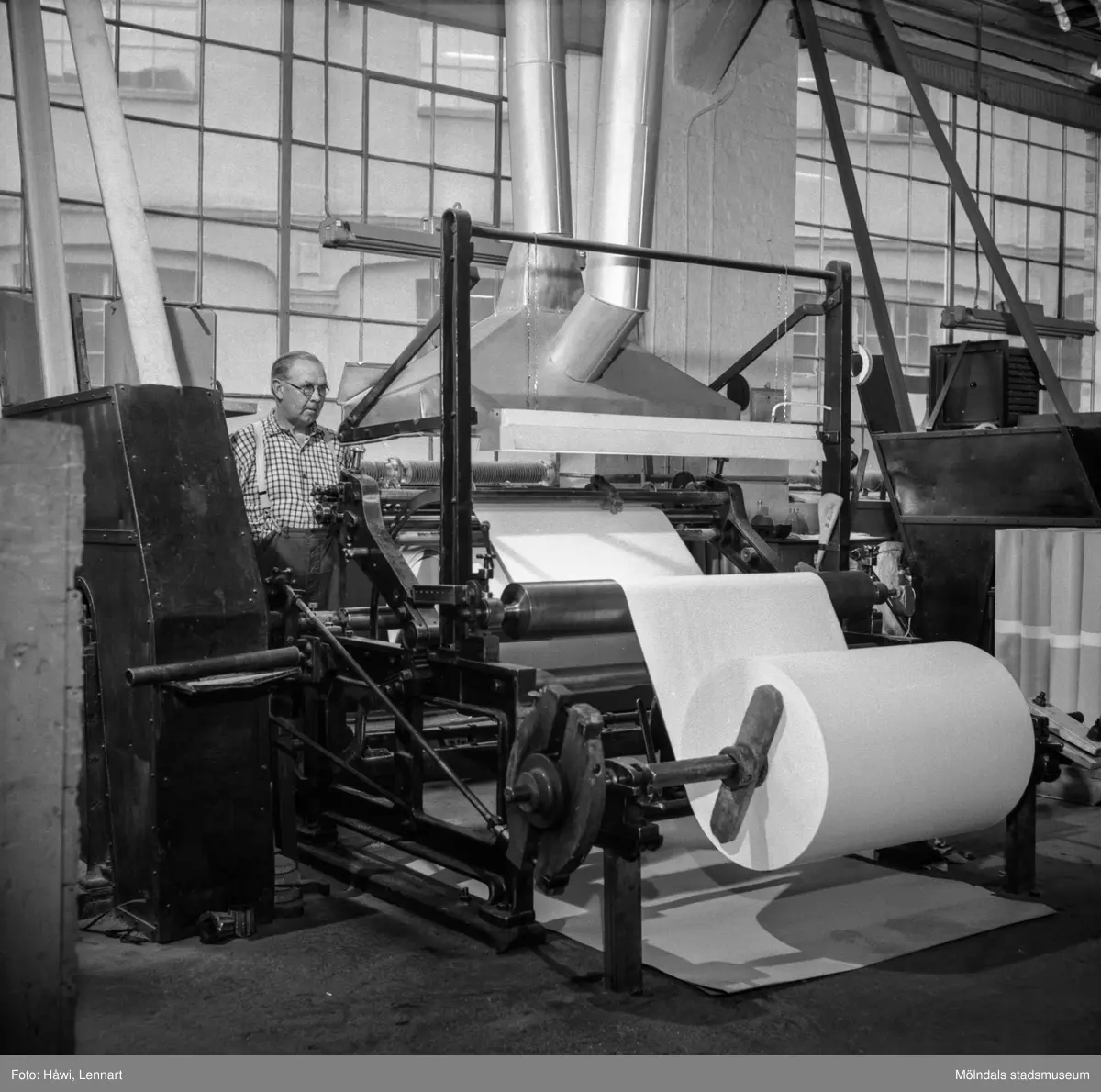 Man i arbete vid rullmaskin nr 2 på pappersbruket Papyrus i Mölndal, 6/5 1955.
