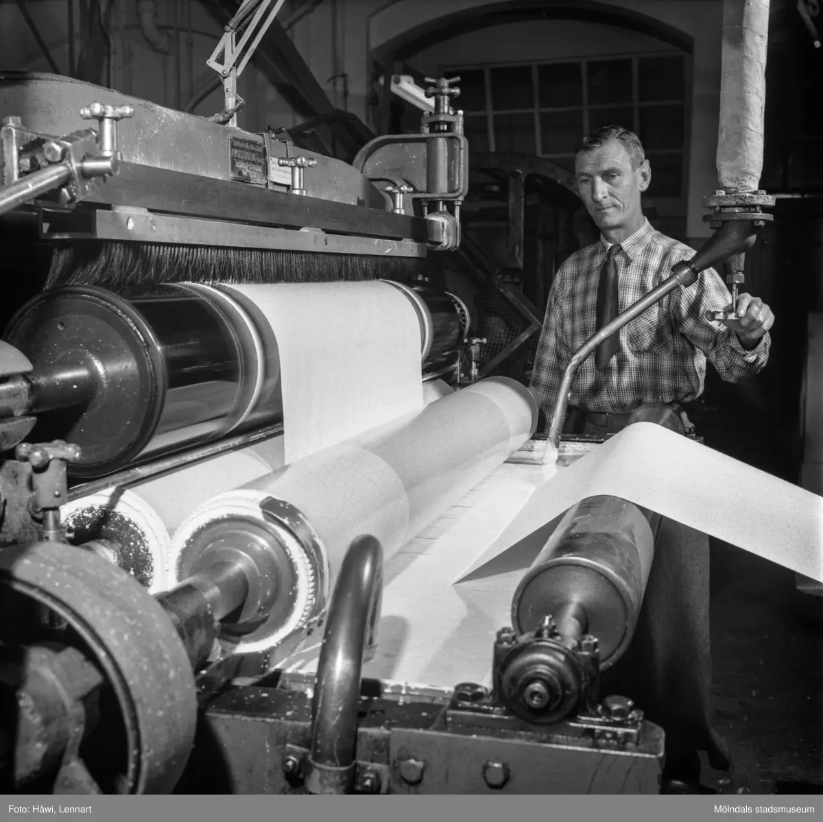 Man i arbete vid maskin på pappersbruket Papyrus i Mölndal, 6/5 1955.