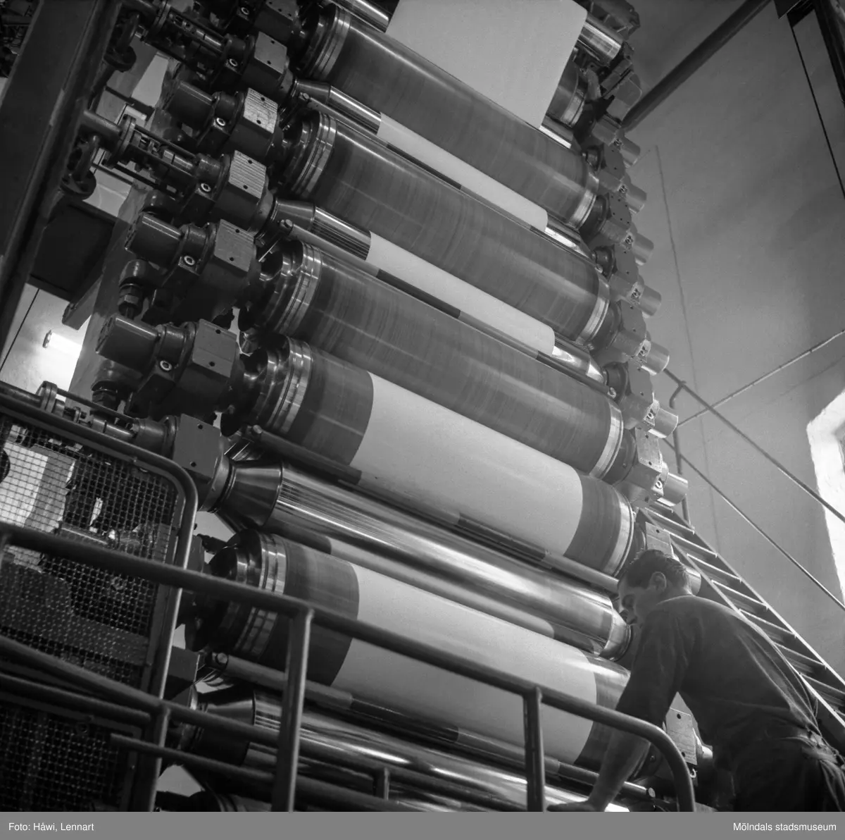 Åke Lundgren i arbete vid maskin på pappersbruket Papyrus i Mölndal, 6/5 1955.