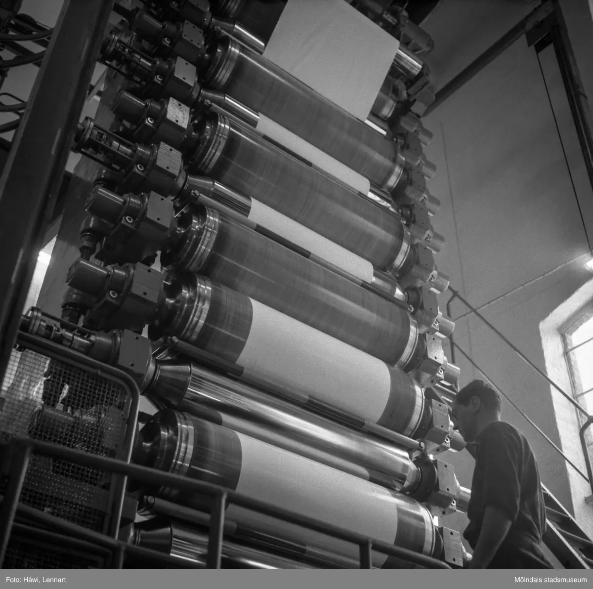 Åke Lundgren i arbete vid maskin på pappersbruket Papyrus i Mölndal, 6/5 1955.