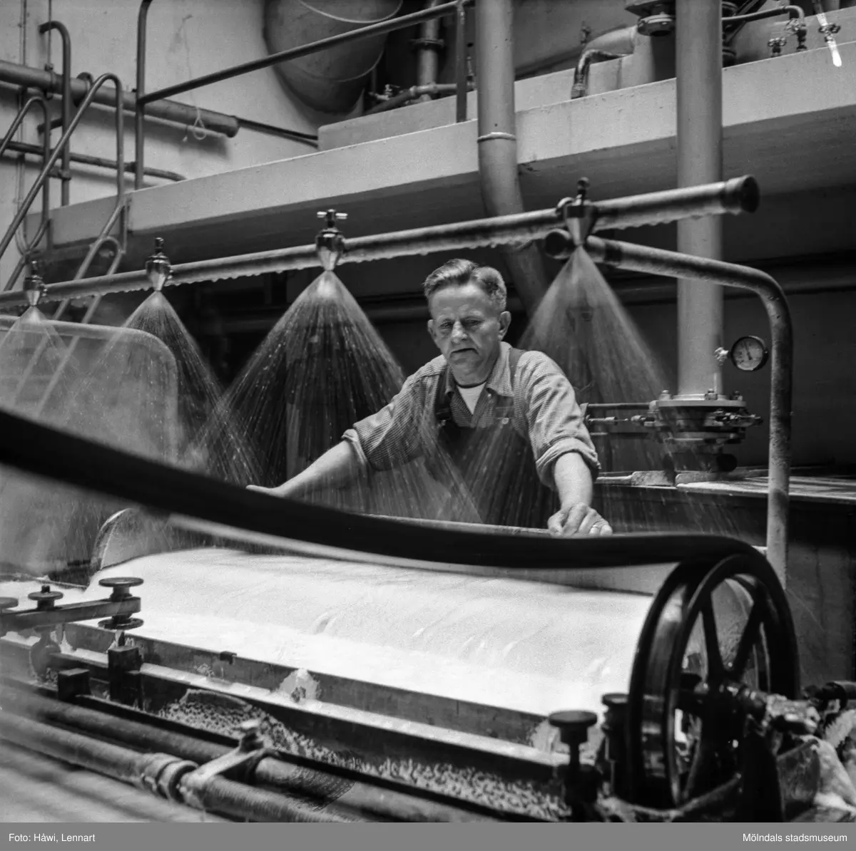 Titel: Man i arbete vid maskin på pappersbruket Papyrus i Mölndal, 6/5 1955.