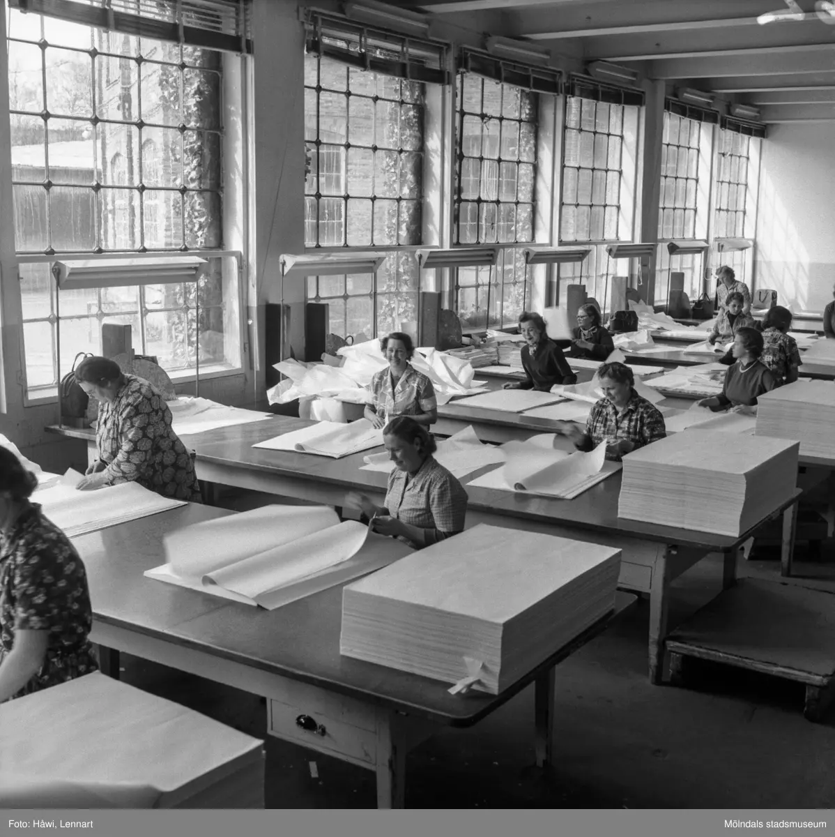 Kvinnor i arbete i sortersalen på pappersbruket Papyrus i Mölndal, 6/5 1955.