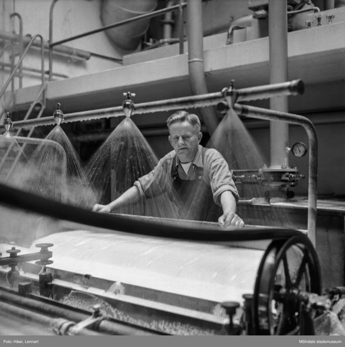 Man i arbete vid maskin på pappersbruket Papyrus i Mölndal, 8/5 1955.