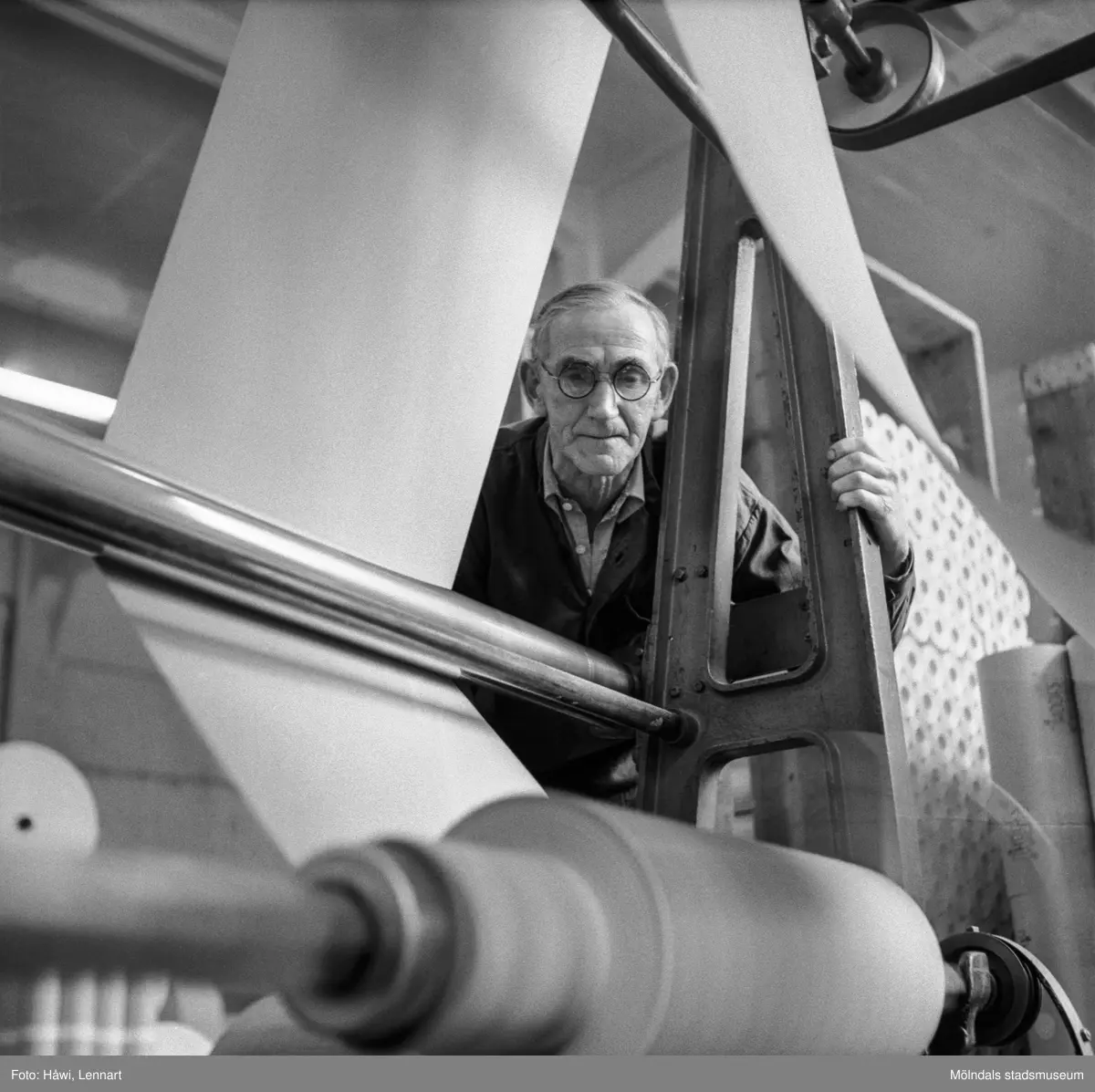 Man i arbete vid maskin på pappersbruket Papyrus i Mölndal, 8/5 1955.