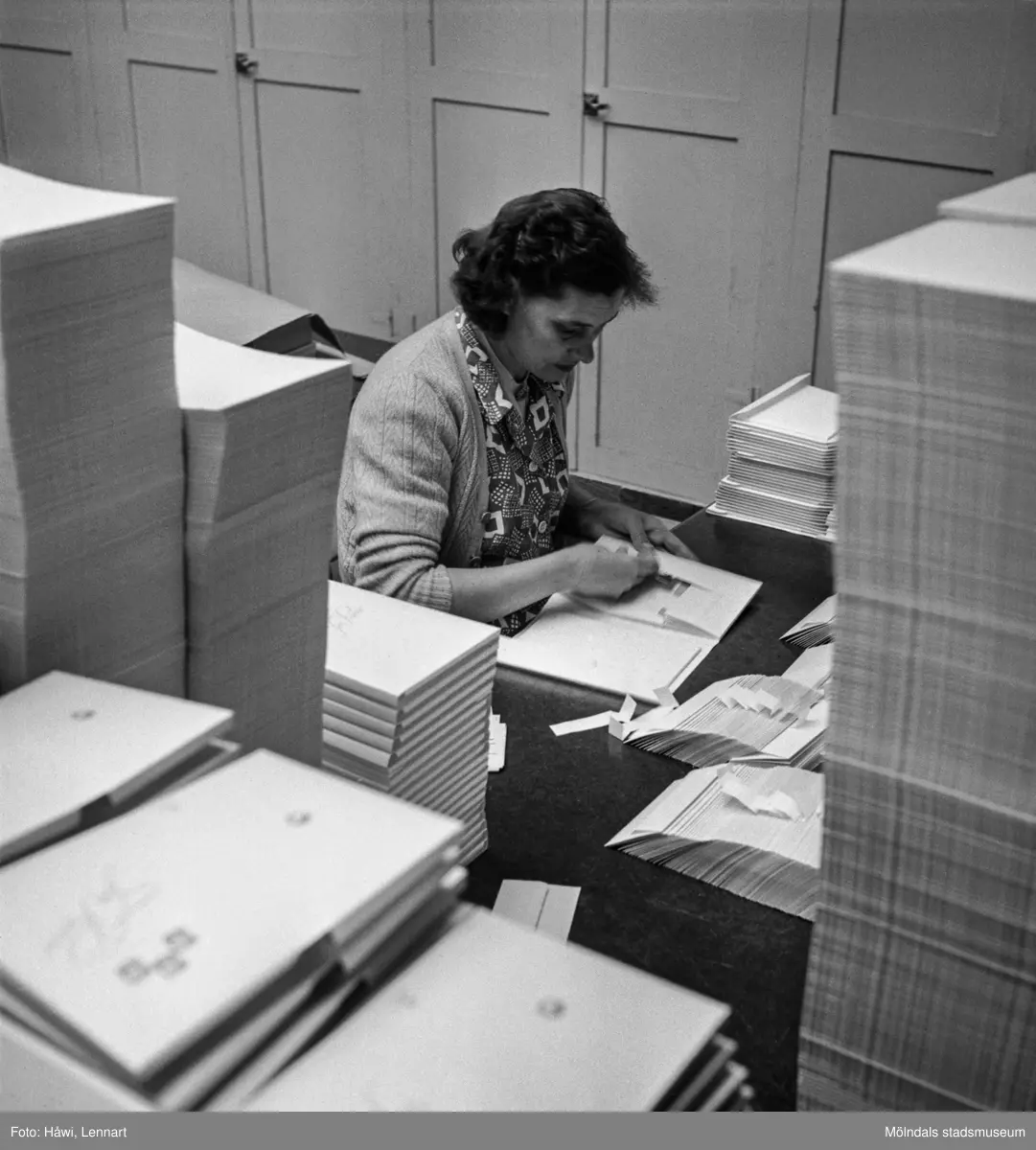 Kvinna i arbete med papeteritillverkning på pappersbruket Papyrus i Mölndal, 13/5 1955.