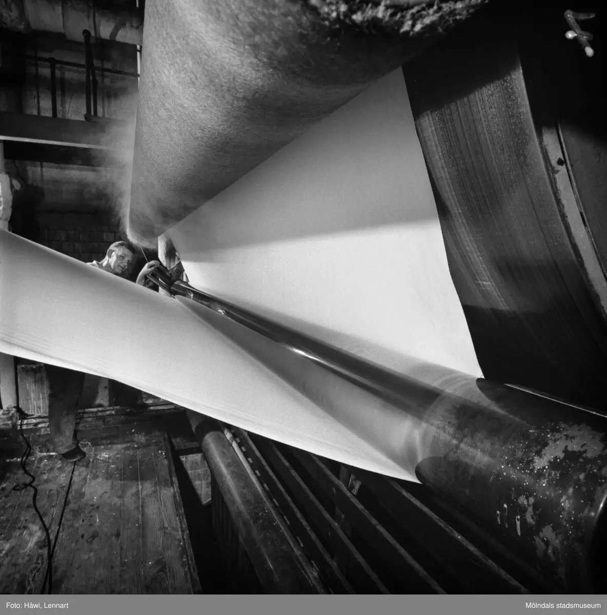 Man i arbete vid PM12, torkparti, på pappersbruket Papyrus i Mölndal, 13/5 1955.