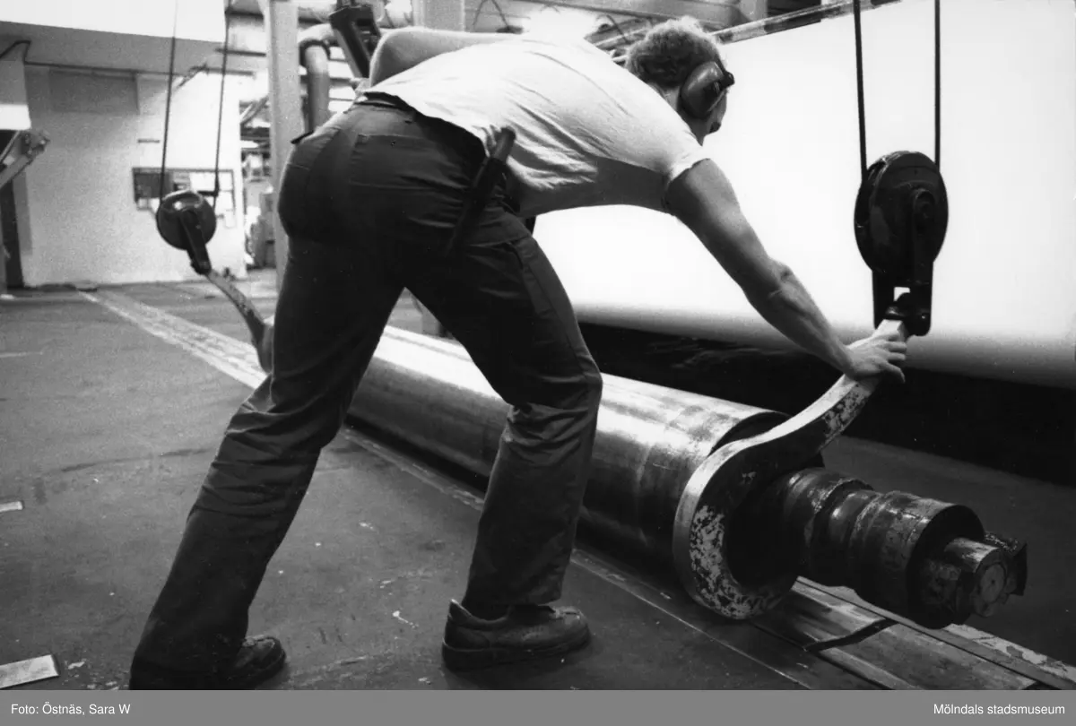 Byte av kartongrulle på pappersbruket Papyrus i Mölndal, år 1990.