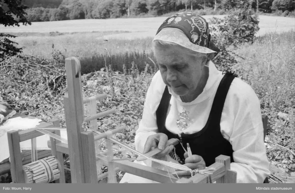 Hembygdsdag på Långåker i Kållered år 1984. "Lilly Edwardsson visade bandvävningens svåra konst."