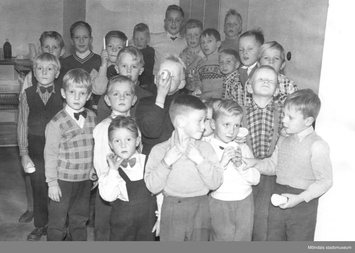 Luciafest med boende på Ryet i skyddsrumslokalen i källaren på Rygatan 13 i Mölndal, i mitten på 1950-talet.