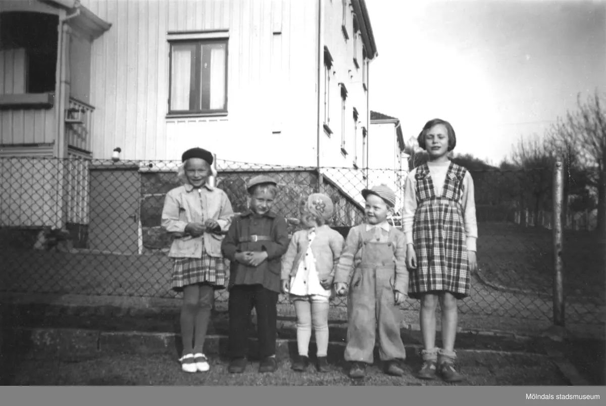 Barnen Inger, Leif, Ann-Mari, ev. Söderlund och Eva vid Brunnsgatan mellan nr. 3 och 5 i Mölndal, cirka 1952 - 53.