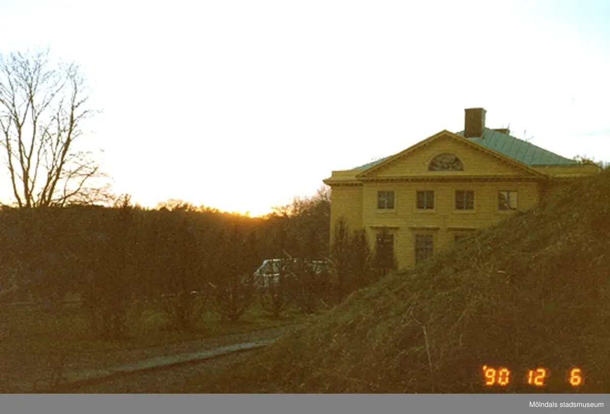 En kvällsbild snett från öster på Gunnebo slott, december 1990.