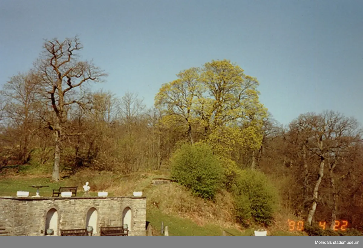 En stenmur med en kulle bakom. Gunnebo slott, april 1990.