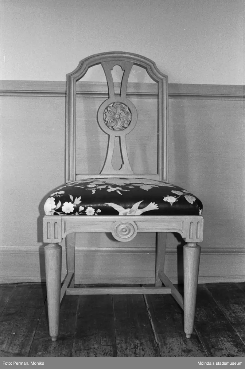 Antikvarisk storstädning på Gunnebo slott 1992. En stol som står utmed en väggpanel.