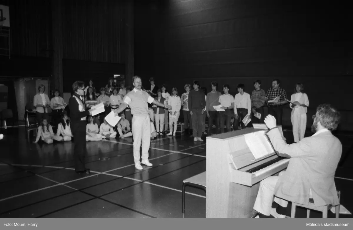 Temavecka på Ekenskolan i Kållered, år 1984. Repetition av musikalen Joseph. "Jan Ivar Blixt vid pianot instruerar kör och dansare."