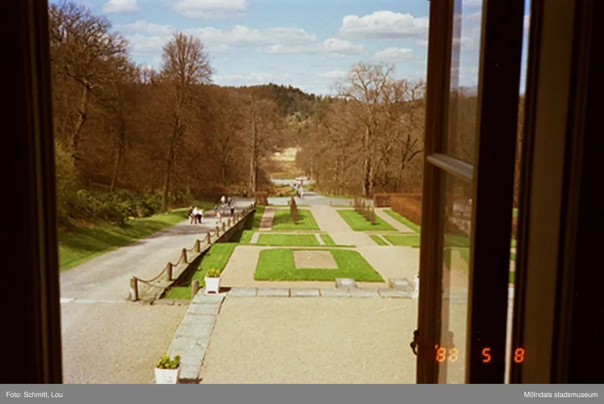 En del av parken på Gunnebo slotts vänstra framsida. Bilden är tagen inifrån och ut genom ett öppet brunt fönster. Långt i bakgrunden skymtar man John Halls väg.
