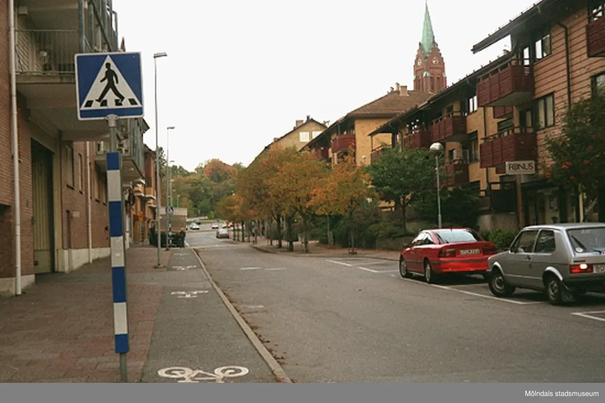 Västra delen av Bergmansgatan. Kyrkan ses i fonden. Mölndalsbro i dag - ett skolpedagogiskt dokumentationsprojekt på Mölndals museum under oktober 1996. 1996_1320-1337 är gjorda av högstadieelever från Åbyskolan 8A, grupp 5. Se även 1996_0913-0940, gruppbilder på klasserna 1996_1382-1405 och bilder från den färdiga utställningen 1996_1358-1381.
