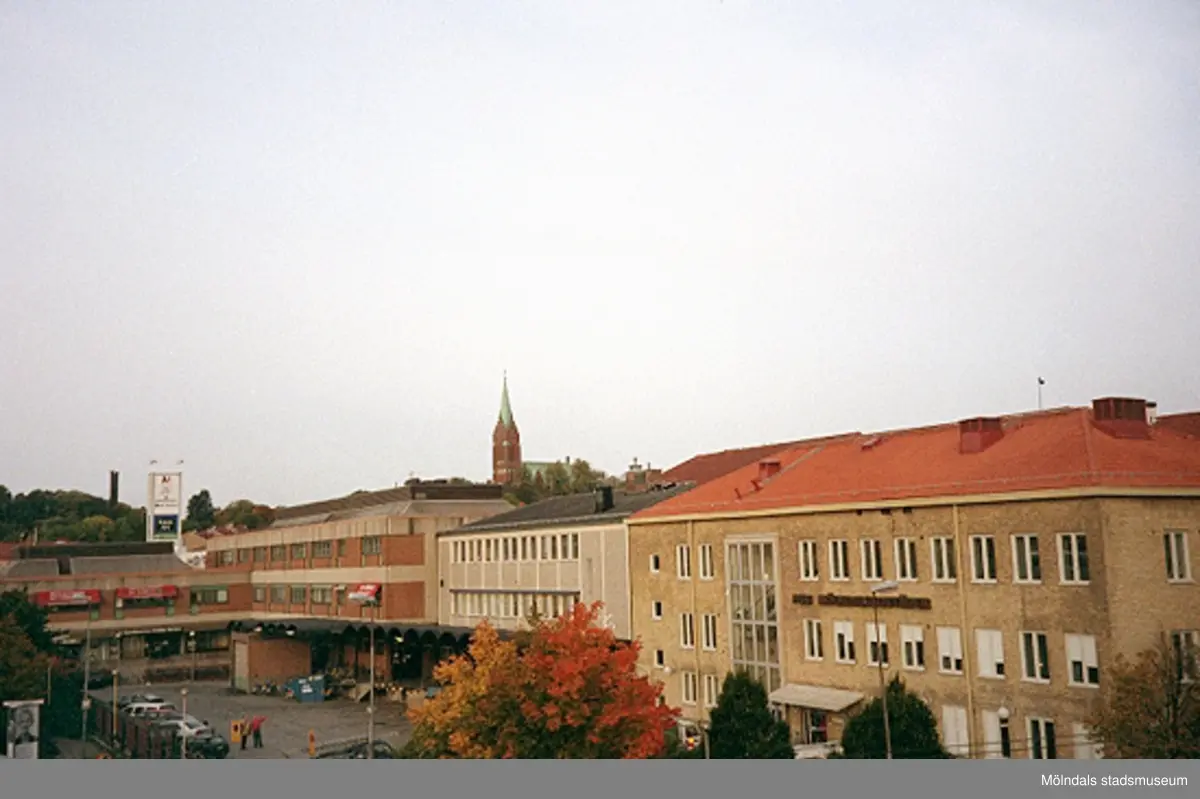 Vy från bron över Broplatsen. Kyrkan tronar i bakgrunden. Mölndalsbro i dag - ett skolpedagogiskt dokumentationsprojekt på Mölndals museum under oktober 1996. 1996_1338-1356 är gjorda av högstadieelever från Åbyskolan 8A, grupp 6. Se även 1996_0913-0940, gruppbilder på klasserna 1996_1382-1405 och bilder från den färdiga utställningen 1996_1358-1381.