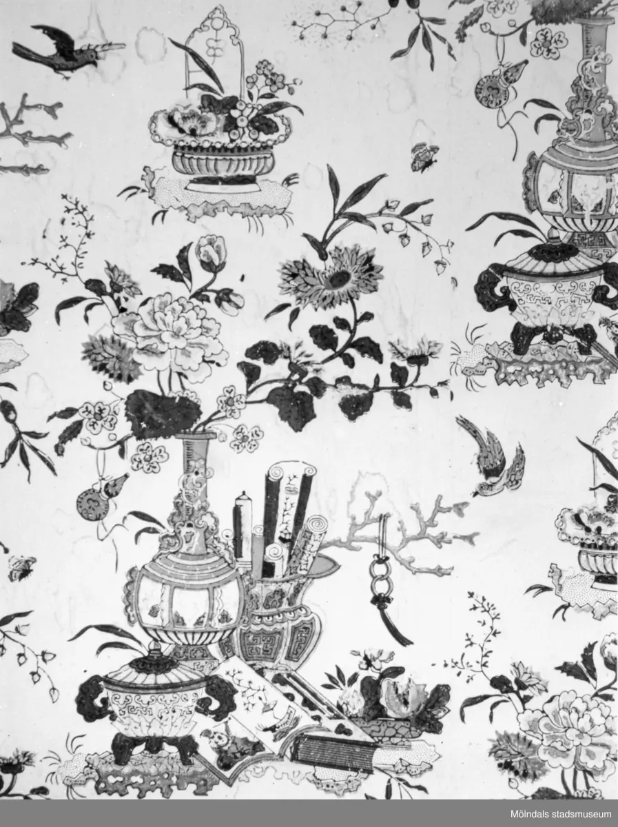 Ostindiskt tapetmönster i "Kinesen", gästrum på Gunnebo slotts övervåning. 1920-tal.