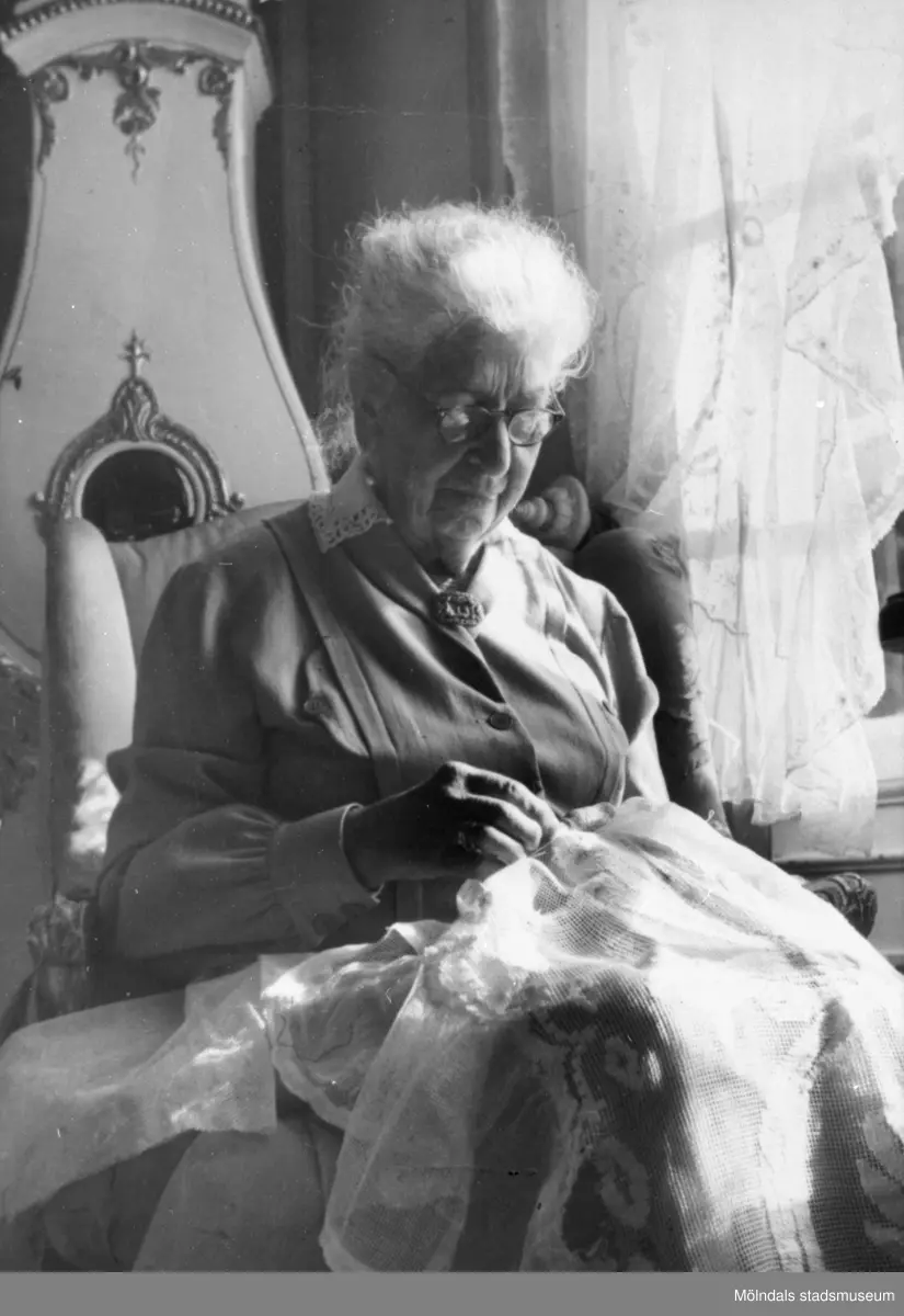 Hilda Sparre sitter och syr i sin syhörna mot södra sidan. Gunnebo slott, 1948.