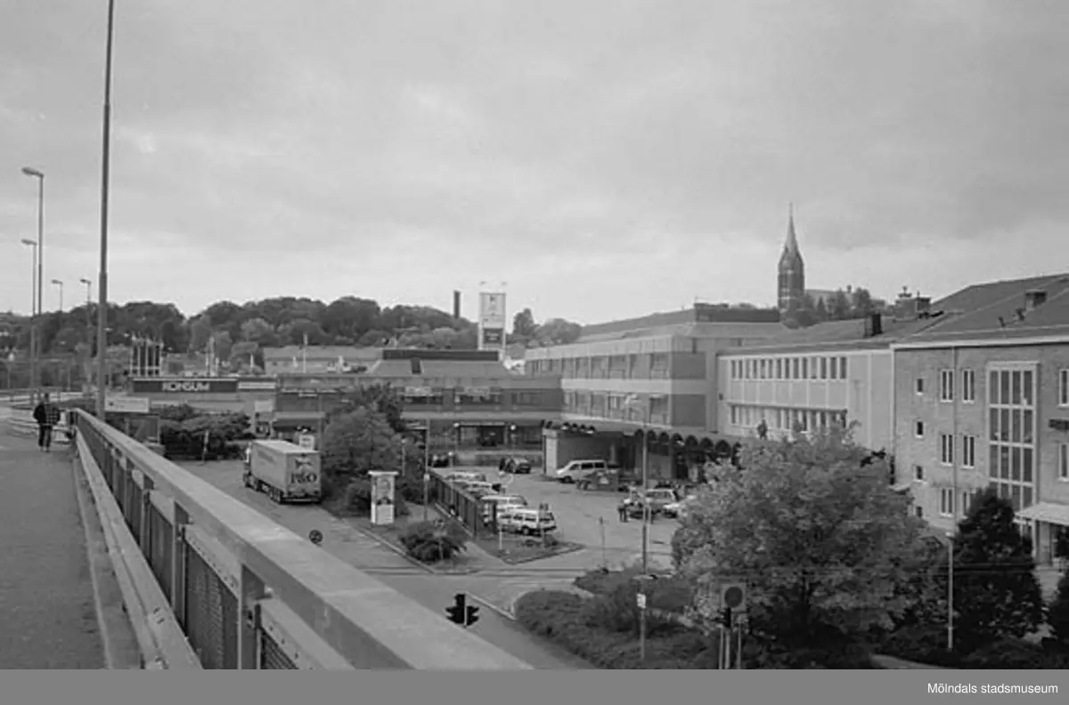 Broplatsen till höger, sedd från bron. Mölndalsbro i dag - ett skolpedagogiskt dokumentationsprojekt på Mölndals museum under oktober 1996. 1996_0950-0965 är gjorda av högstadieelever från Kvarnbyskolan 9A, grupp 3. Se även 1996_0913-0940, gruppbilder på klasserna 1996_1382-1405 samt bilder från den färdiga utställningen 1996_1358-1381.