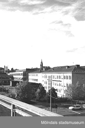 Vy västerut från Mölndals bro mot Broplatsen och kyrkan. Längst ner till höger ses biltrafik på Göteborgsvägen. Mölndalsbro i dag - ett skolpedagogiskt dokumentationsprojekt på Mölndals museum under oktober 1996. 1996_1005-1023 är gjorda av högstadieelever från Kvarnbyskolan 9A, grupp 6. Se även 1996_0913-0940, gruppbilder på klasserna 1996_1382-1405 samt bilder från den färdiga utställningen 1996_1358-1381.