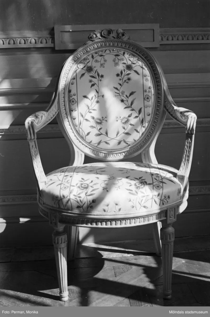Dokumentationsbilder från Gunnebo slott våren 1992. Inredningsmiljö, konstföremål och möbler av varierande slag. Här ses en stol ståendes vid en vägg.