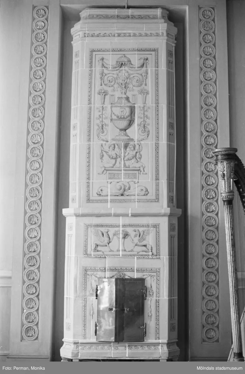 Dokumentationsbilder från Gunnebo slott våren 1992. Inredningsmiljö, konstföremål och möbler av varierande slag. Här ses en av husets kakelugnar.