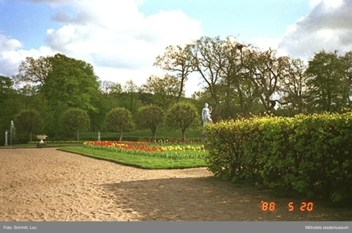 Del av blomsterrabatt där det står en skulptur, och en häck i Gunnebo slottspark.