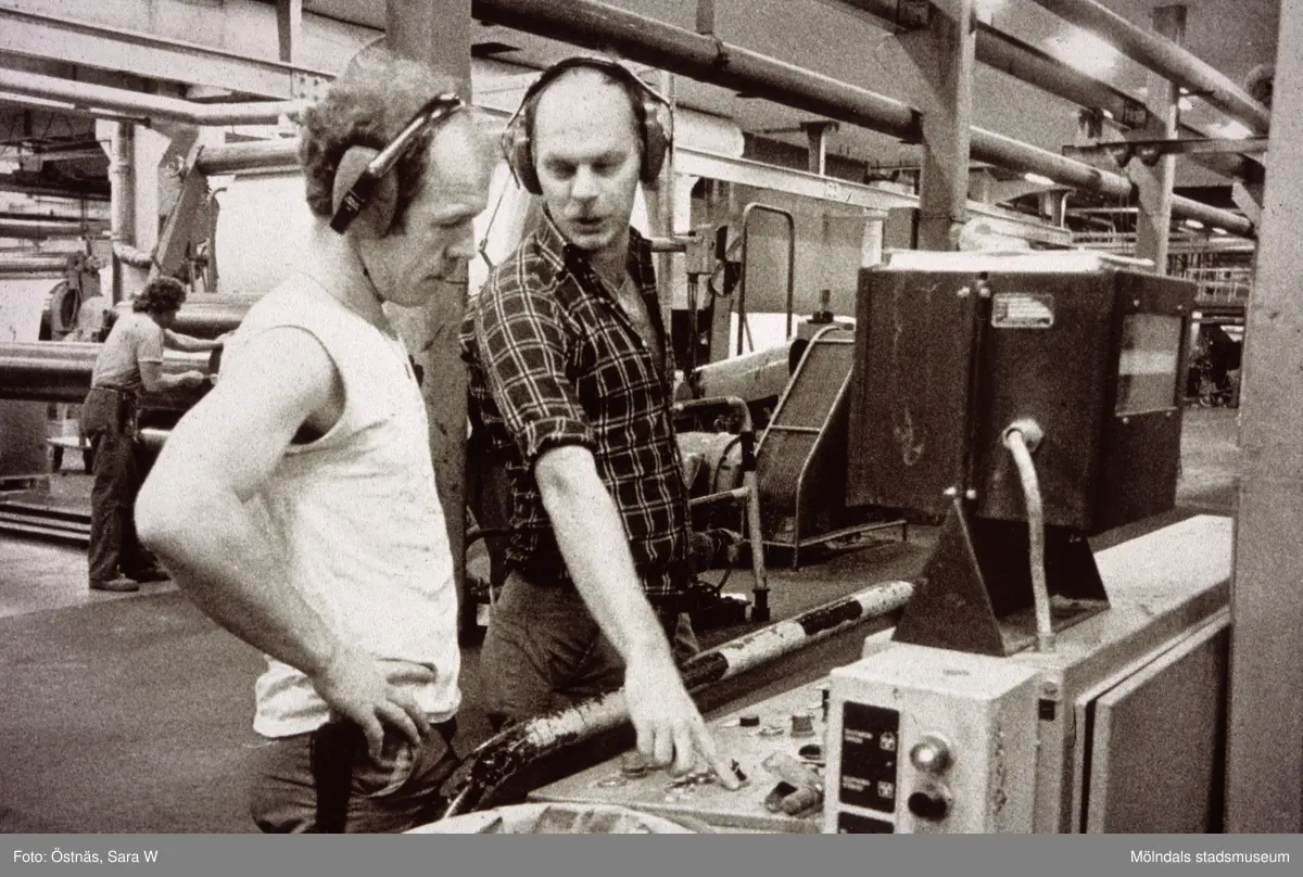 Jan Callesen och Denny Andersson i arbete vid maskin på Papyrus i Mölndal, år 1990.