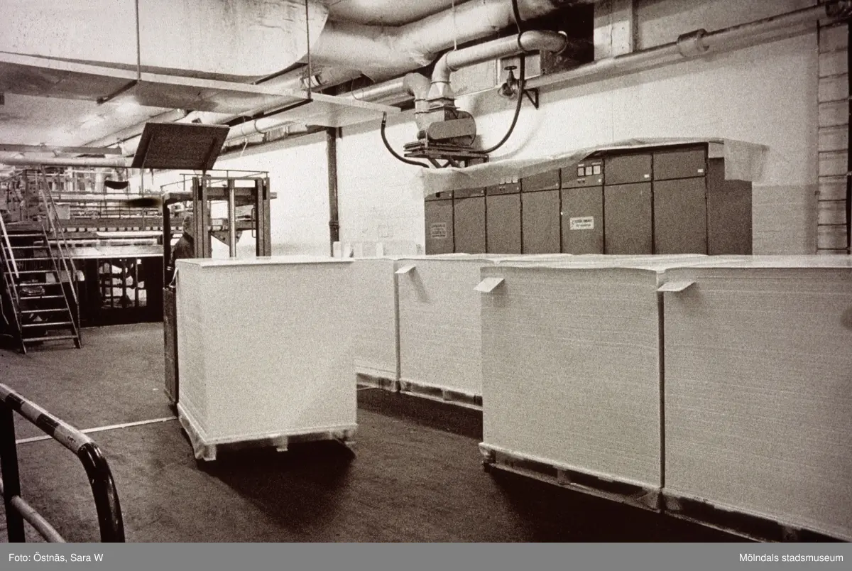 Transport av kartongpallar med truck på Papyrus i Mölndal, år 1990.