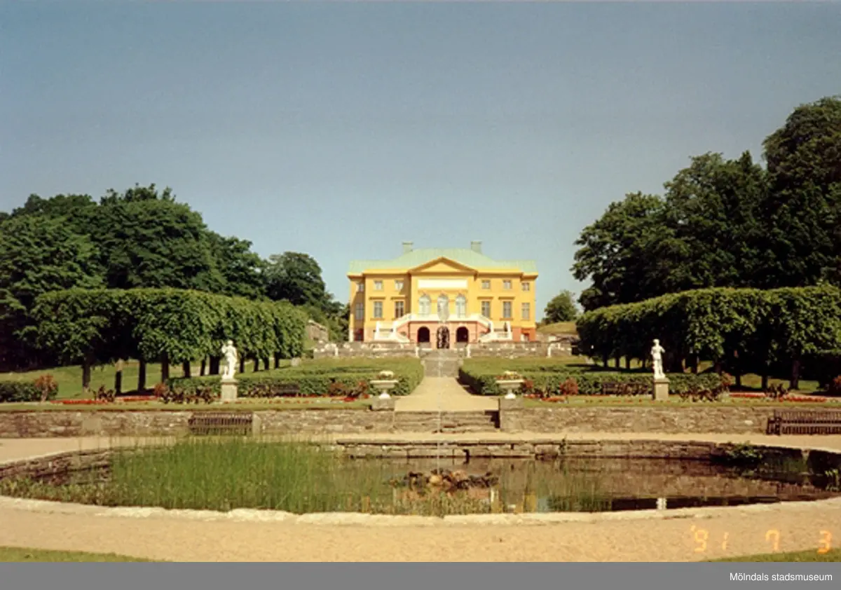 En damm och två statyer på Gunnebo slotts baksida, juli 1991.